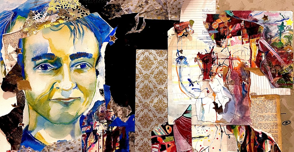 Life is, and, gets messy – well mine did. On the page I pulled colour in while my line let the junk and chaos out. Painting after painting, page after page.In these times I focus on eyes for the same reasons we all do – searching, seeing, looking for our environment and each other. My