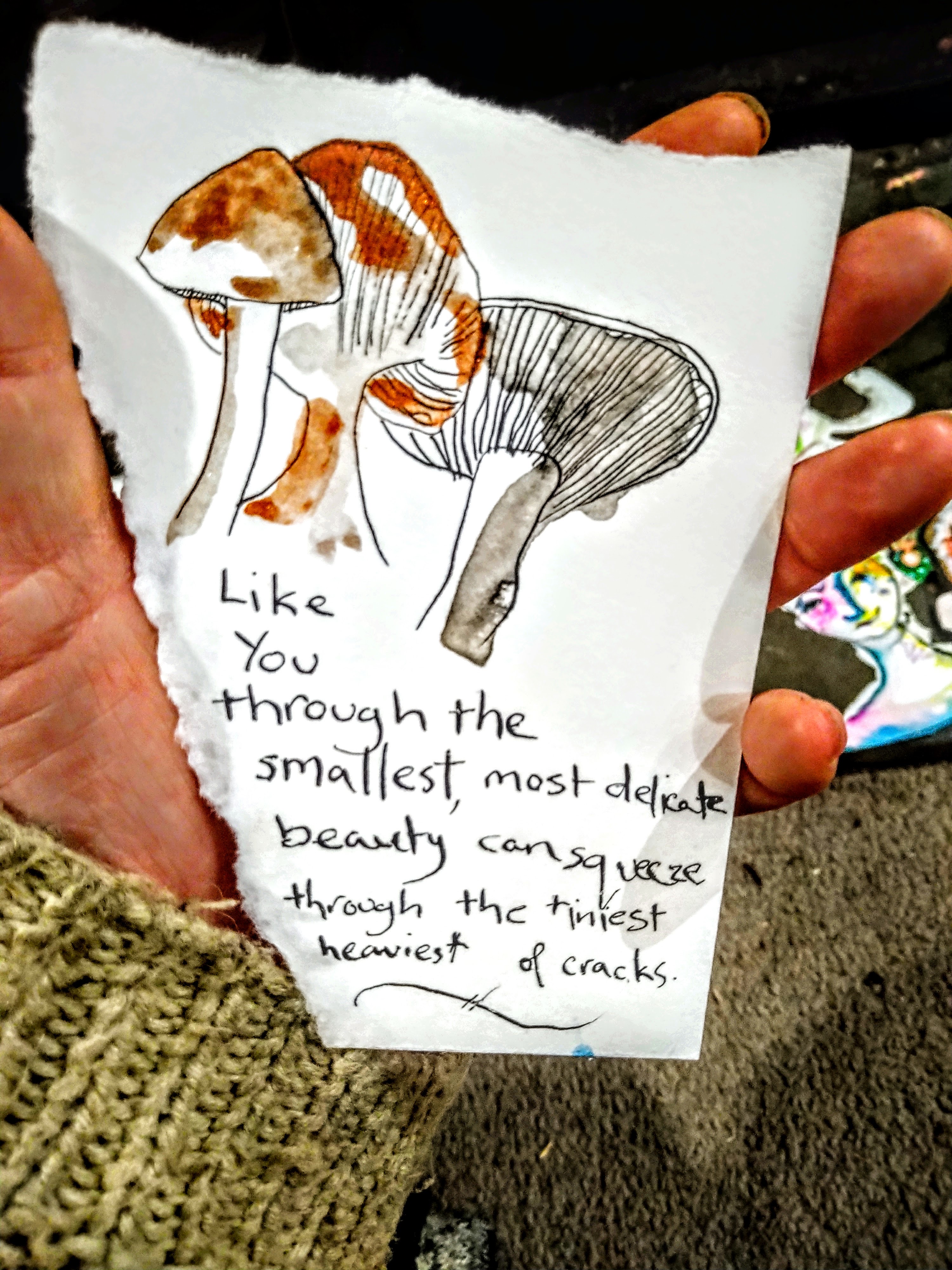 As I said welcome, I am excited to be creating a stronger presence on the web – to be starting again and be returning to my internet roots. Fifteen years ago when I lived in the hills with a 100 other people, ( my child being the 100th), I blogged. I blogged about the mist, raising a child, cups of tea and mushrooms found above my house in the bush. This one might be a little different with the focus more on my art, my process and the understandings I have come to over the years. But, of course there may be mushrooms as well, though these ones will be found pushing up through the concrete of the city. Far from those hills.